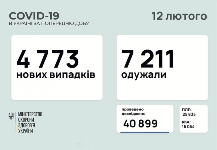 За добу 11 лютого в Україні діагноз COVID-19 підтвердили 4 773 особам, госпіталізували 2 000 осіб, не змогли врятувати 116 хворих, одужали після коронавірусу 7 211 українців.