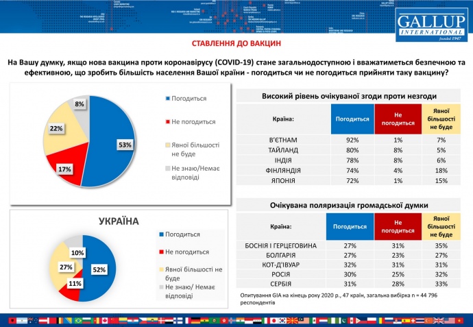 Більшість респондентів у всьому світі вважає, що переважна частина людей в їхніх країнах вакцинувалася б, якби існувала доступна, безпечна і ефективна вакцина від коронавірусу. Ще 17% вважають, що більшість в їхній країні не погодиться на введення вакцини, а 22% не вважають, що в цьому питанні буде явна більшість.