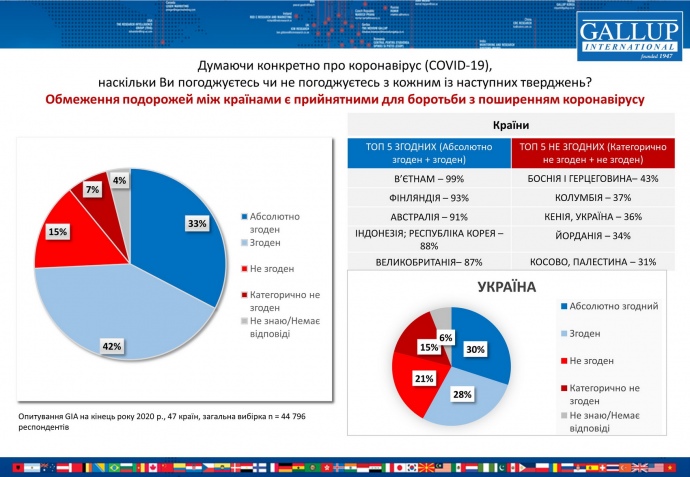 Вивчення ставлення до коронавірусної кризи Міжнародною асоціацією Геллап охопило 47 країн світу і близько 45000 дорослих громадян, що становить близько 2/3 населення світу.