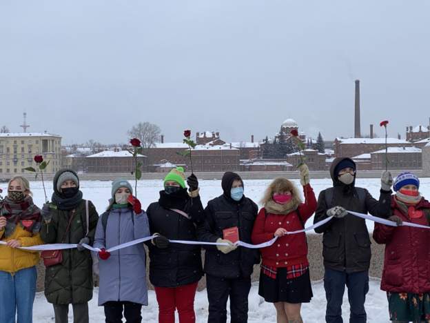У Петербурзі близько 70 активістів вишикувалися біля пам'ятника жертвам політичних репресій з білою стрічкою і червоними квітами і сердечками з іменами політв'язнів.