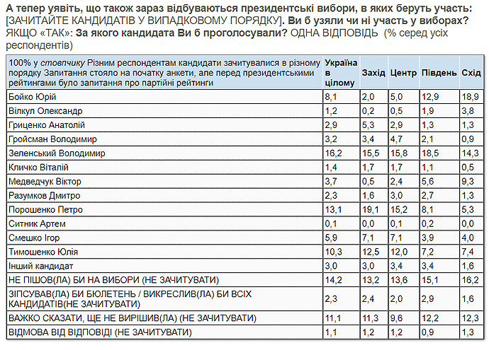 Вказується, що респонденту пропонували наведений в Таблиці 1 список можливих кандидатів на виборах президента, а респондент мав обрати того, за кого він проголосував би.