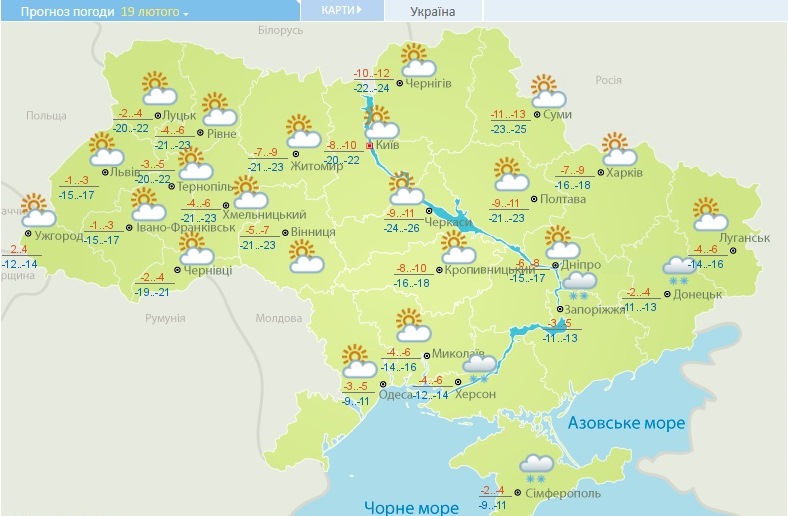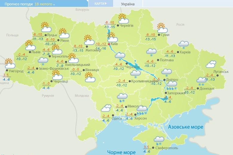 18-го лютого вдень у північних областях -7-14 градусів, на решті території -2-7 градусів, на Півдні -2+3, на Закарпатті та в Криму +1+5 градусів.