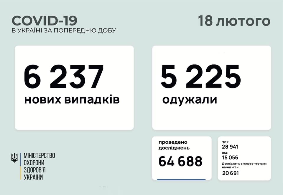 За добу 17 лютого в Україні діагностували 6 237 нових випадків коронавірусної хвороби, госпіталізували 2 222 хворих, померли 163 пацієнти, одужали 5 225 осіб.