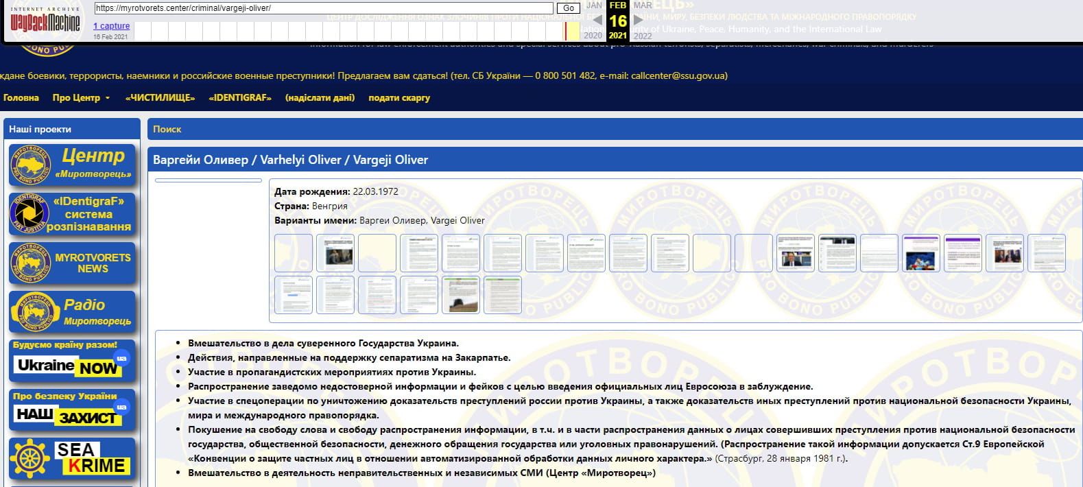 Втім, сторінка доступна у веб-архіві станом на 16 лютого. Як пояснюється, "Миротворець" додав члена Європейської комісії через "втручання у справи суверенної держави Україна", "дії, спрямовані на підтримку сепаратизму на Закарпатті" і "участь в пропагандистських заходах проти України".