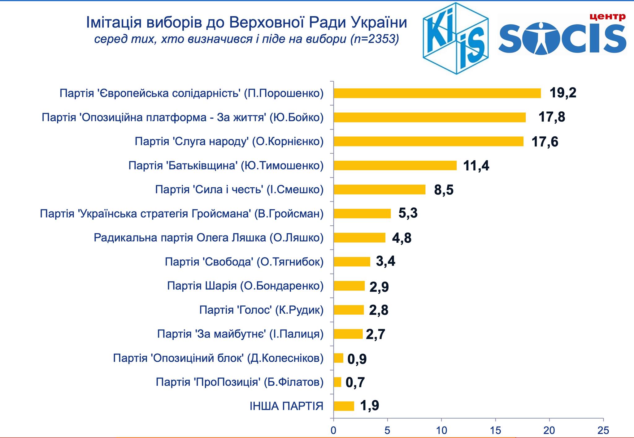 За результатами опитування КМІС і центру "Социс", якби вибори до Верховної Ради відбувалися у найближчий час, то подолали б 5% бар’єр 6 партій, а лідирує "Європейська солідарність" - 19,2%.