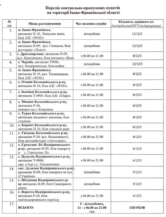 Деталі: На території області працюватимуть 16 карантинних пунктів, з яких 5 – у цілодобовому режимі: в Івано-Франківську – на автошляху Н-10, біля АЗС, на автошляху Н-09 біля ресторану "Лелеч" та у селі Черніїв.