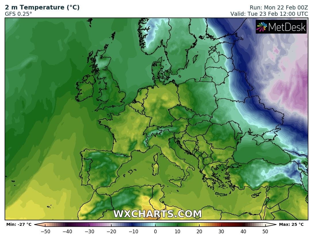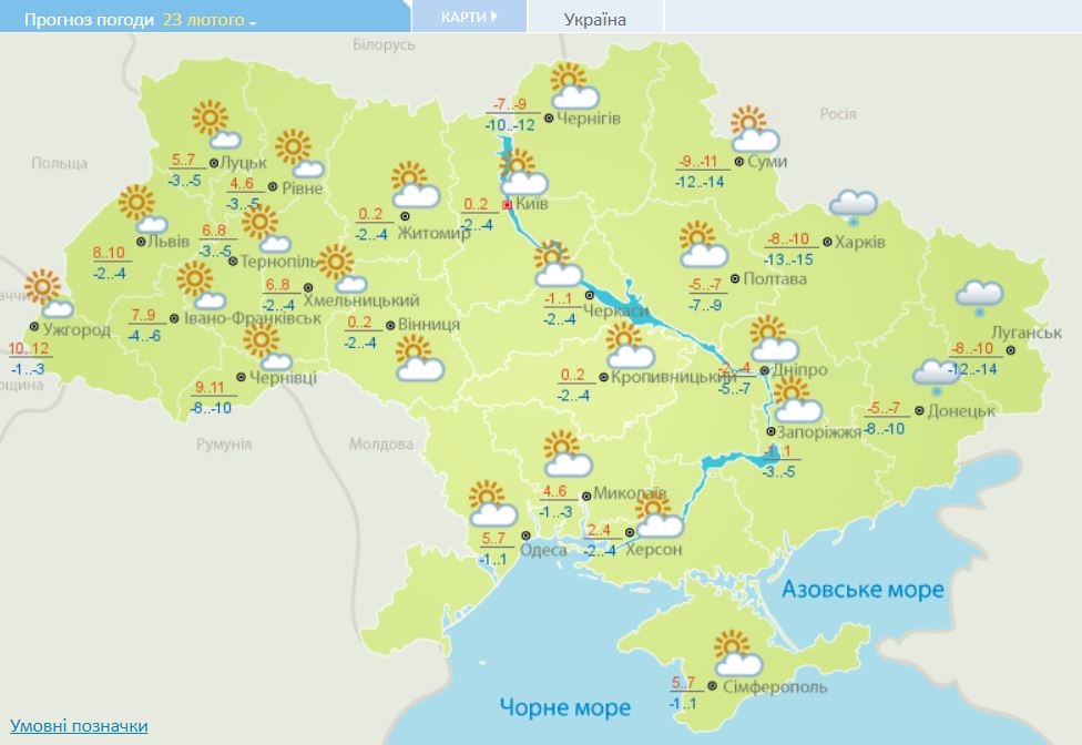 У вівторок 23 лютого на сході країни прогнозують 5-12 градусів морозу, а на заході України місцями до 12 градусів тепла.
