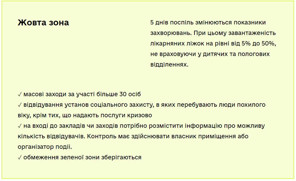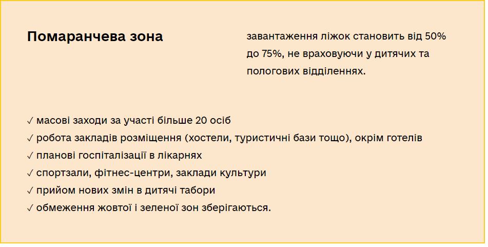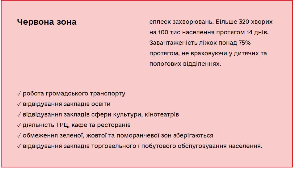 Перелік заборон для "червоної", "помаранчевої" та "жовтої" зони: