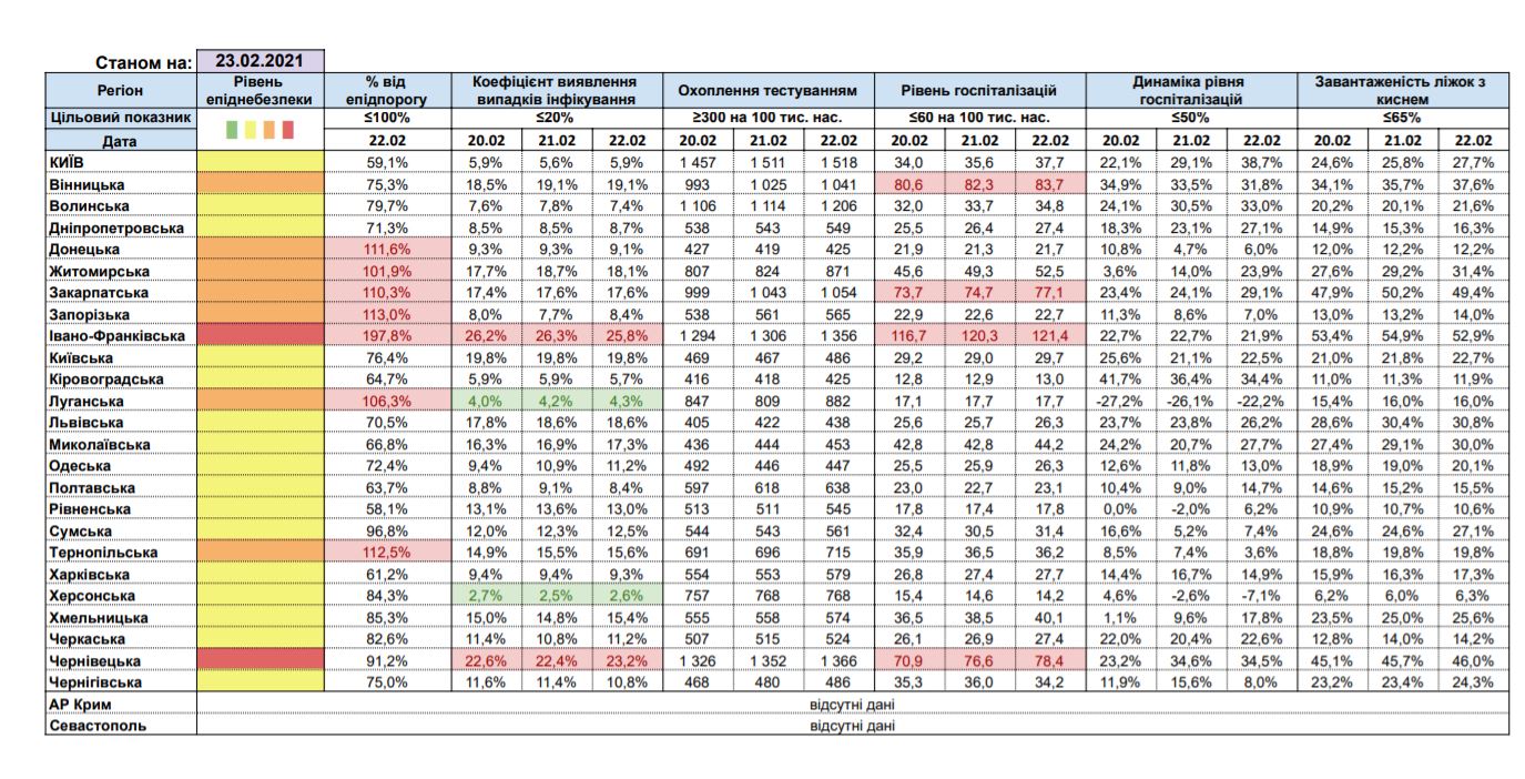 В Україні оновили список "червоних", "помаранчевих" та "жовтих" областей за показниками захворюваності на коронавірус, рівнем госпіталізації та завантаженістю лікарень.