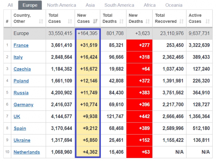 У країнах Європи лідерами антирейтингу за кількістю нових випадків COVID-19 є Франція, Італія та Чехія. Україна зараз на 9-му місці. У відповідному світовому антирейтингу Україна на 17-му місці.