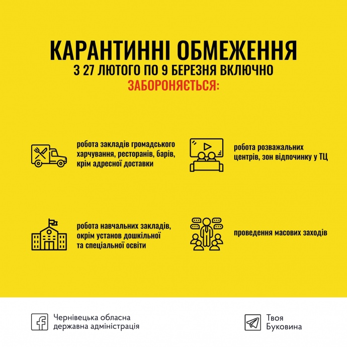 Деталі: Зокрема, з 27 лютого до 9 березня включно у Чернівецький області забороняється робота: