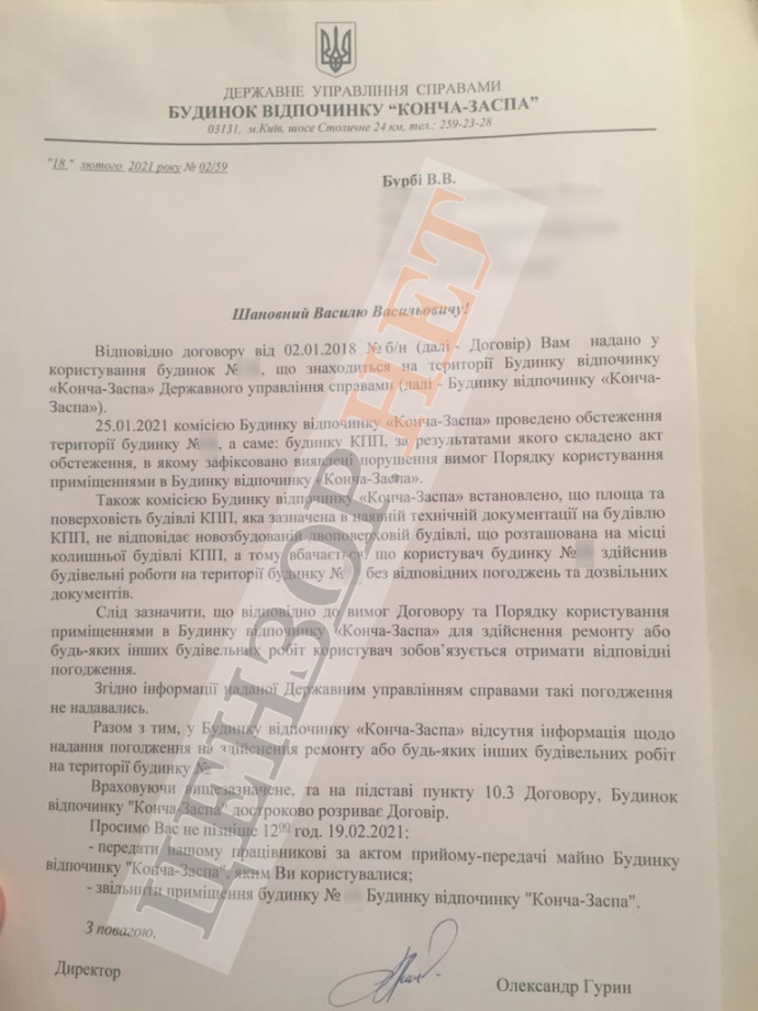Додатково: Офіційною причиною виселення з будинку є ремонтні роботи, проведені сім'єю Бурби без погодження з ДУС. На підтвердження своїх слів Бутусов опублікував лист до Бурби, направлений йому Державним управлінням справами.