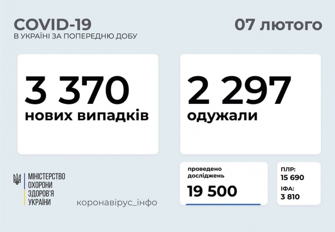 Дослівно: "3370 нових випадків коронавірусної хвороби COVID-19 зафіксовано в Україні станом на 7 лютого 2021 року. Зокрема, захворіли 188 дітей та 96 медпрацівників".