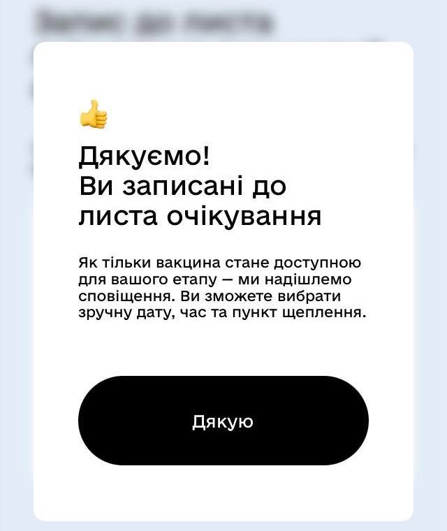 У випадку, коли людина не лікар, не військовий і не соцпрацівник, то їй згодом надішлють сповіщення, коли саме вона зможе вакцинуватися.