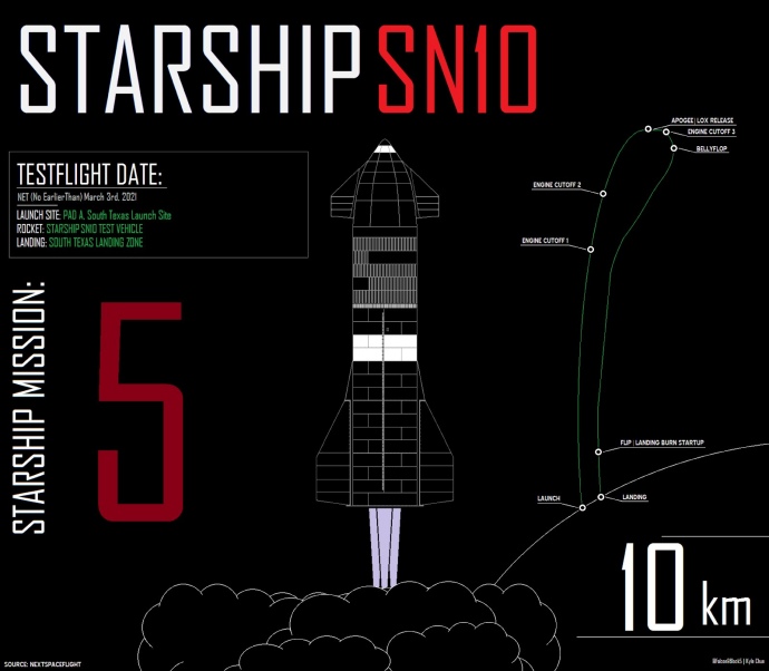 Американська приватна космічна компанія SpaceX винахідника Ілона Маска 4 березня здійснила випробувальний запуск на 10 кілометрів десятого прототипа міжпланетного багаторазового корабля Starship. Прототип зумів приземлитись, однак невдовзі вибухнув.