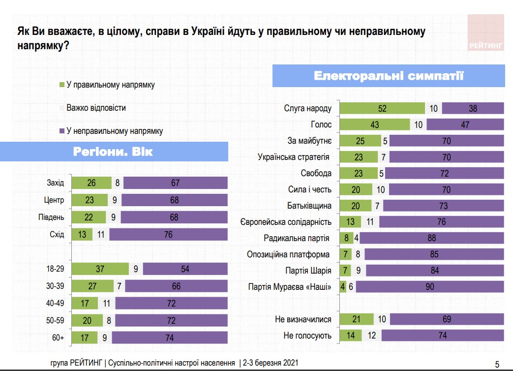 При цьому в жодній із вікових груп і в жодному регіоні кількість прихильників нинішнього курсу країни не перевищує кількість противників.