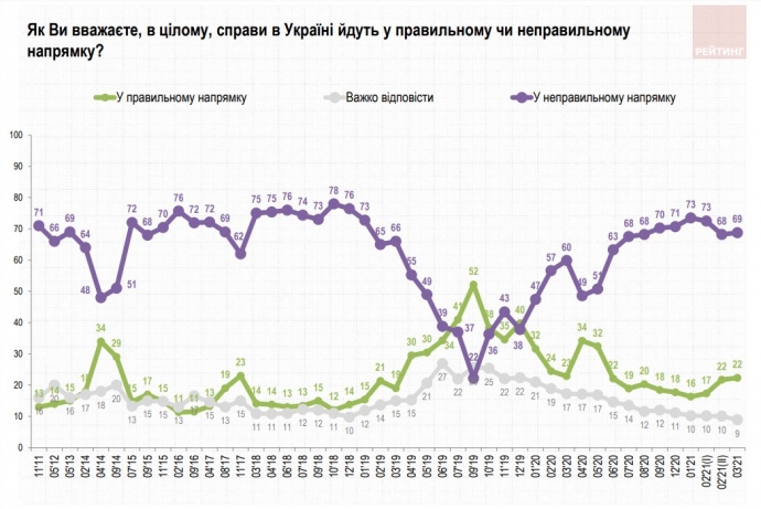 За даними опитування соцгрупи "Рейтинг", проведеного 22-23 лютого, 68% українців вважали, що країна рухається у неправильному напрямку, 22% – у правильному, 10% – не визначилися.
