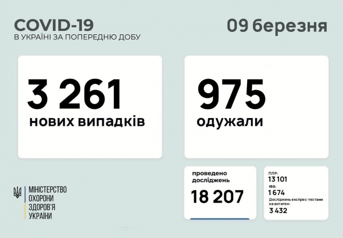 За святковий день 8 березня в Україні діагноз COVID-19 встановили 3 261 людині, госпіталізували 1 837 осіб, померли 76 хворих, одужали 975 осіб.