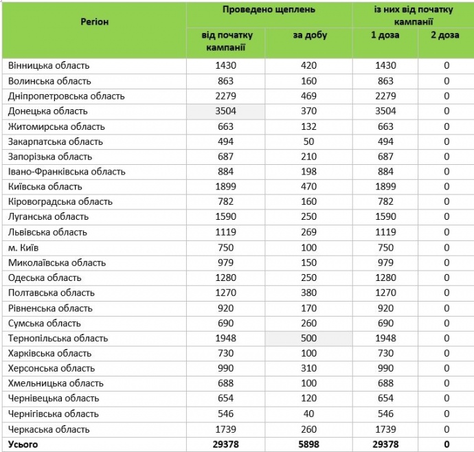 Деталі: Усього з початку кампанії з вакцинації щеплено 29 378 громадян України, всі вони отримали першу з двох дозу вакцини.