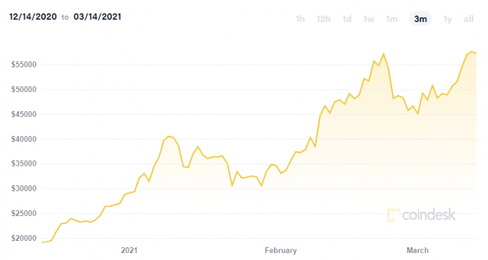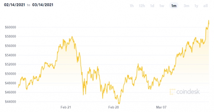 Деталі: 13 березня вартість одного біткоіна досягла $61 089.