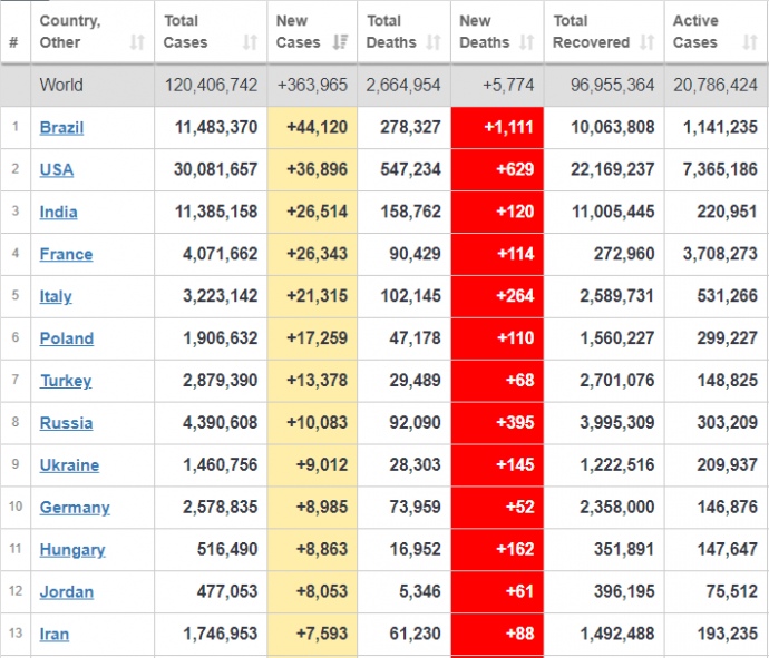 За минулу добу у світі діагностували майже 364 тисячі нових випадків захворювання на коронавірус. Найбільше хворих виявили у Бразилії, США та Індії, Україна займає 9 місце у світі.