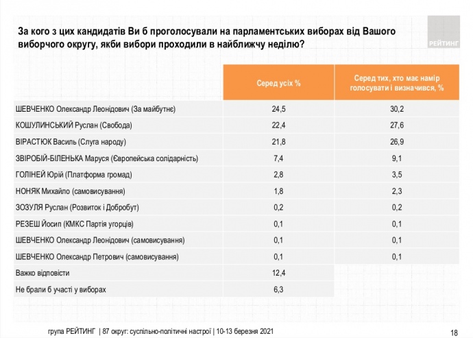 Додатково: За результатами березневого опитування соціологічної групи "Рейтинг", серед кандидатів у 87 окрузі лідером є наближений до олігарха Коломойського ексдиректор туристичного комплексу "Буковель" Олександр Шевченко (висувається від партії "За майбутнє"), якого підтримують 30,2% тих, хто визначився і взяв би участь голосуванні. Руслана Кошулинського підтримують 27,6%, Василя Вірастюка від "Слуги народу" – 26,9%.