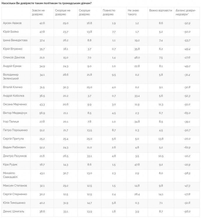 При цьому найкращий баланс довіри й недовіри – у Дмитра Разумкова, Сергія Притули, лідерки "Голосу" Кіри Рудик та секретаря РНБО Олексія Данілова.