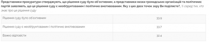 Серед тих, хто знає про рішення суду, оцінки розділилися – 34% дотримуються думки, що рішення суду було об’єктивним, і 34% - що рішення суду є необґрунтованим і політично вмотивованим, ще 32% не змогли дати оцінку.