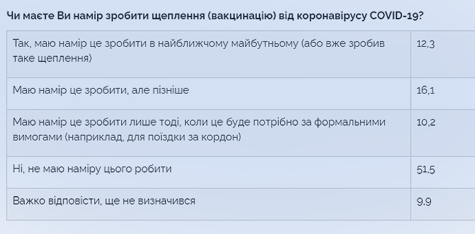 Дослівно: "51,5% респондентів відповіли, що не мають наміру робити щеплення від коронавірусу, 12% мають намір зробити його в найближчому майбутньому (або вже зробили таке щеплення).