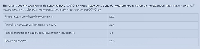 Серед тих, хто планує вакцинуватися від COVID-19, 52% готові робити це лише за умови, що щеплення буде безкоштовним, 22,5% з – поміж них готові платити за нього, а ще 5% готові платити за те, щоб вакцинуватися поза чергою. 21% не визначилися.