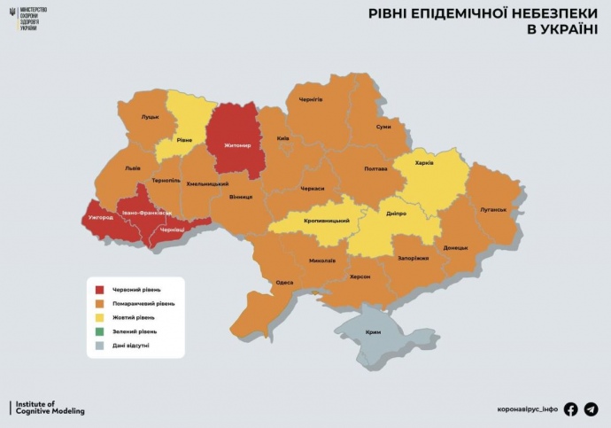 В Україні 16 регіонів і столиця опинилися в "помаранчевій" зоні за показниками поширення коронавірусу, 4 області - "жовті", стільки ж "червоних".