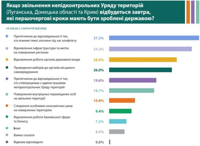 Притягнення до відповідальності тих, хто вчинив тяжкі злочини під час конфлікту (37,2%), відновлення інфраструктури та житла на повернених регіонах (34,2%), відновлення роботи органів державної влади (28%), проведення виборів до органів місцевого самоврядування (26%).