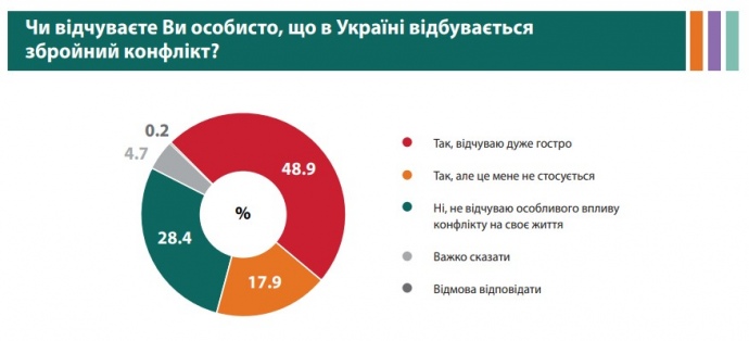 Згідно із результатами 48,9% респондентів відповіли, що відчувають на собі, що в Україні відбувається збройний конфлікт, 28,4% відповіли, що не відчувають особливого впливу конфлікту на своє життя.