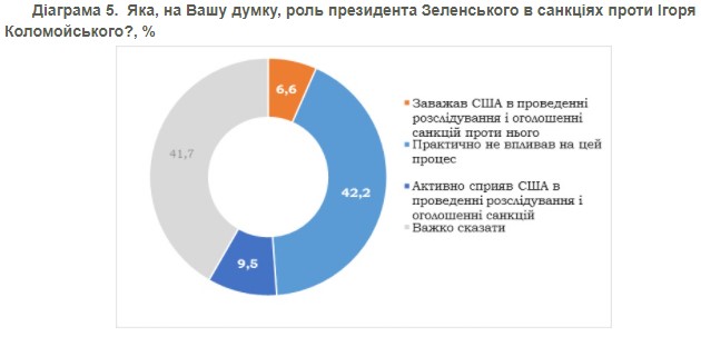 Оцінюючи роль президента Зеленського в запровадженні цих санкцій, 42% вважають, що він не втручався в цей процес, 9% вважають, що він сприяв США у оголошенні санкцій, а 7%, що заважав".