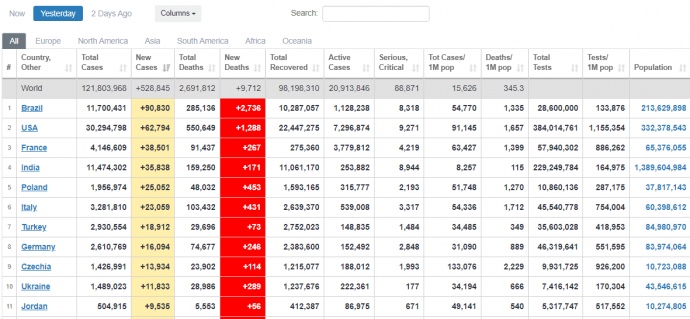 Деталі: Зокрема, у Бразилії – 90 830 нових випадків, у США – 62 794, у Франції – 38 501.