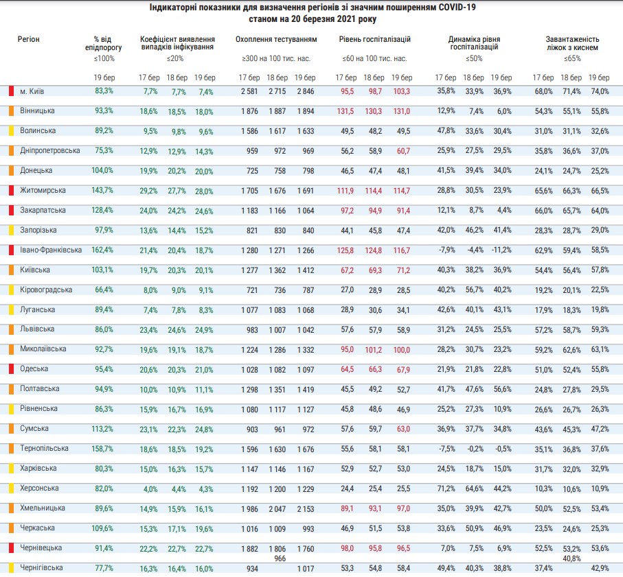 Таким чином, зараз "червоному" рівню відповідають місто Київ, Житомирська, Закарпатська, Івано-Франківська, Одеська та Чернівецька області.