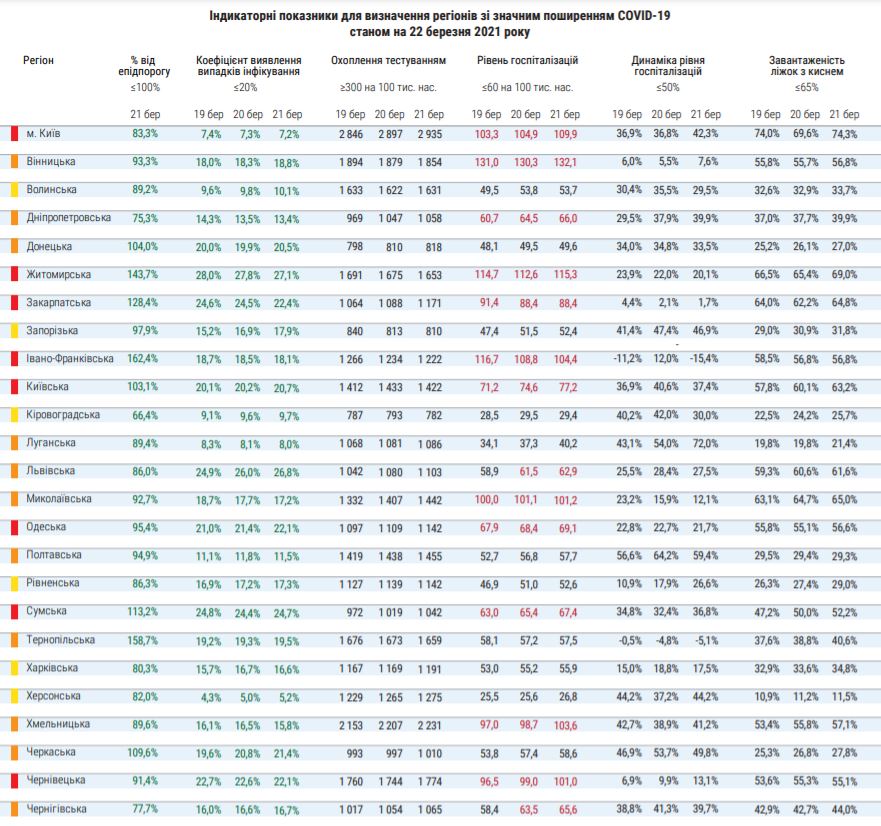 Станом на 22 березня в Україні 7 областей та столиця Київ потрапили до "червоної" зони за показниками поширення коронавірусу.
