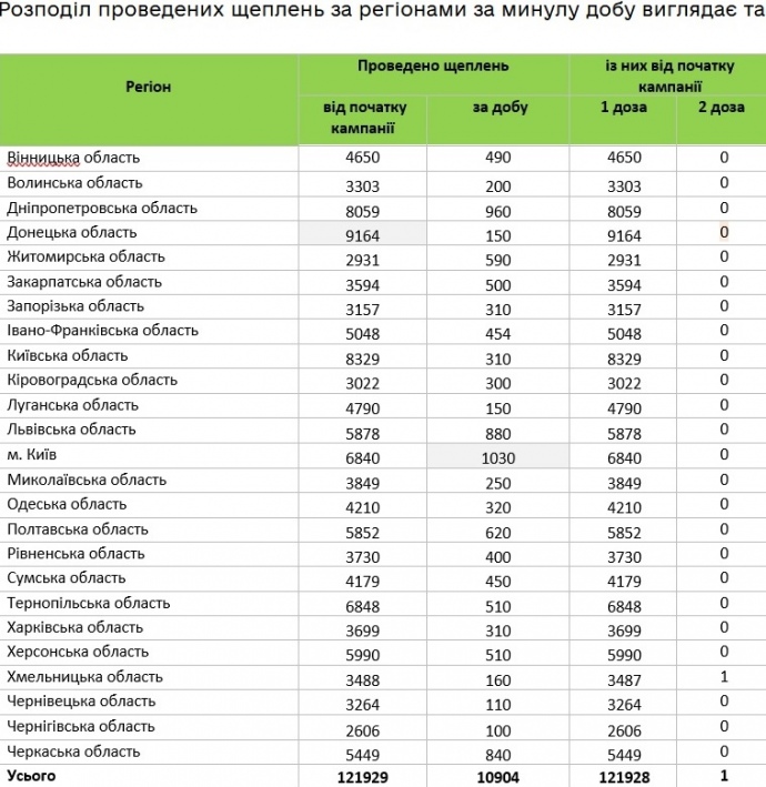 Усього з початку кампанії з вакцинації щеплено 121 929 осіб, з них отримали 1 дозу – 121 928 людей, завершили вакцинацію (отримали 2 дози) – 1 особа.
