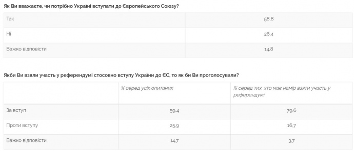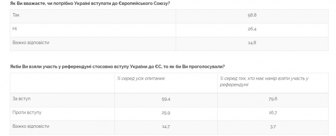 Дослівно: "59% респондентів вважають, що Україні потрібно вступати до Європейського Союзу, 26% дотримуються протилежної точки зору".
