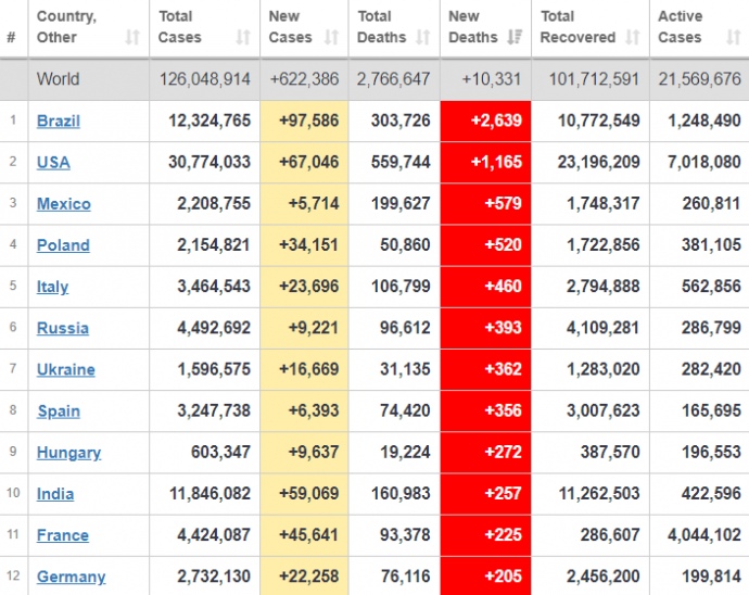 За час пандемії у світі загинуло 2 мільйони 767 тисяч осіб, вилікувались 101,7 мільйони хворих. Активними залишаються 21,5 мільйони випадків.