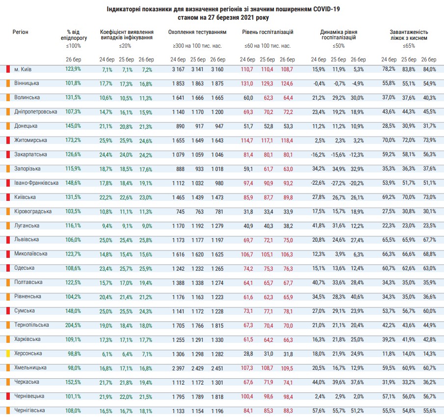 Міністерство охорони здоров'я вдруге за день оновило показники для визначення регіонів зі значним поширенням COVID-19 – тепер до "червоних" віднесено 10 регіонів, а не 13, як було зранку.