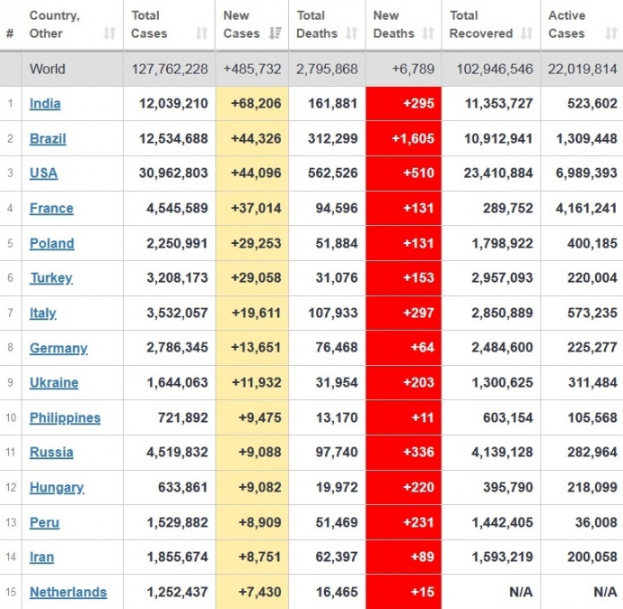 За весь час пандемії вилікувались від недуги майже 103 мільйони осіб. Наразі нараховується понад 22 млн активних випадків захворювання.