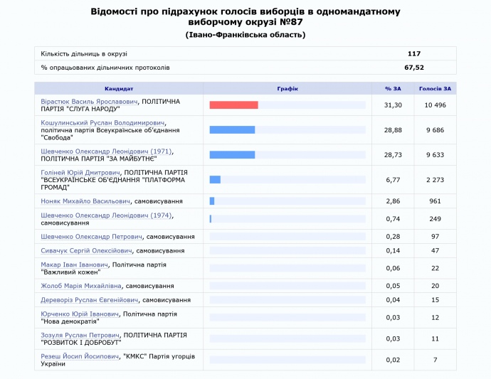 Станом на зараз там є дані про 67,5% порахованих голосів. У Вірастюка наразі 31,3% підтримки, у кандидата від "Свободи" Руслана Кошулинського 28,9%, у Шевченка – 28,8%. Інші претенденти далеко позаду.