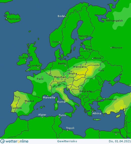 У четвер, 1 квітня, дощі пройдуть у західних та подекуди в північних областях. На решті території України - без істотних опадів. У західних областях з'являться перші грози (на другій карті зона можливих гроз - жовтий чи жовтуватий колір).