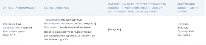 Деталі: В інформації щодо цінного рухомого майна депутат вказав "лева африканського чіпованого". Вартості тварини Джавід не вказав, але придбав лева у травні 2017 року.