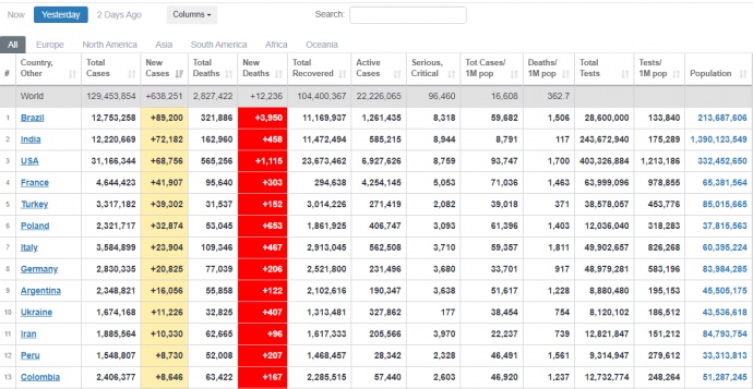 Деталі: Зокрема в Бразилії – 89 200 нових випадків, в Індії - 72 182, а в США – 68 756.