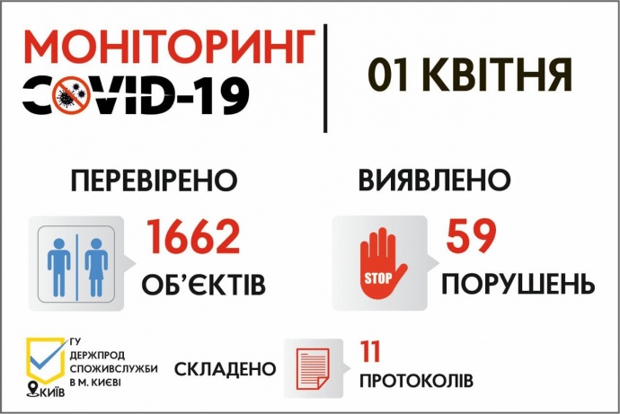 Загалом 1 квітня у Києві перевірили 1662 об’єкти. Зокрема, відвідано 214 закладів громадського харчування, 796 об’єктів торгівлі продовольчими товарами, 622 – непродовольчими товарами. Виявлено 59 порушень.