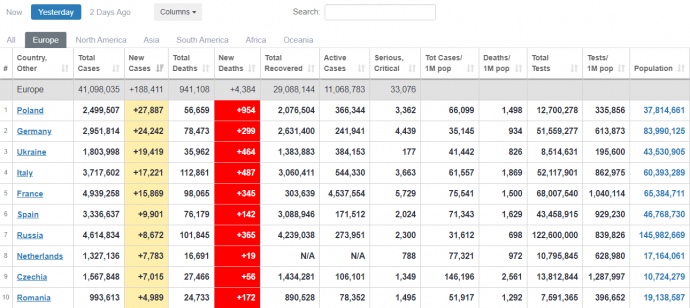 Україна з 19 419 хворими знаходиться на 9 місці у світі – між Іраном (22 586) та Італією (17 221). Серед європейських країн Україна – на третьому місці.