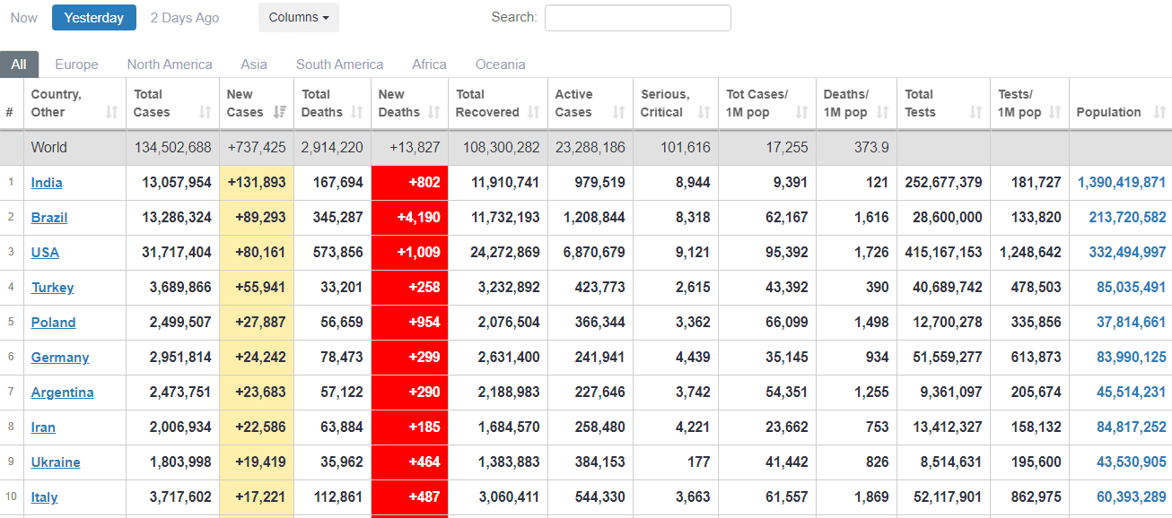 За добу 7 квітня у світі зафіксували 737 425 нових випадків COVID-19. Востаннє настільки високий показник реєстрували 15 січня, коли було 762,6 тисяч хворих на добу.