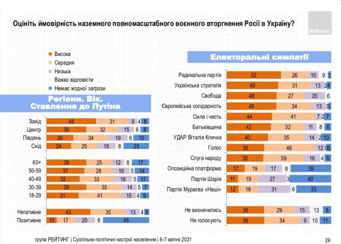 Довідка: Соціологи "Рейтинга" 6-7 квітня опитали 2500 респондентів віком від 18 років в усіх областях, крім окупованих територій Криму та Донбасу. Це були телефонні інтерв'ю з використанням комп'ютера (CATI) на основі випадкової вибірки мобільних телефонних номерів.